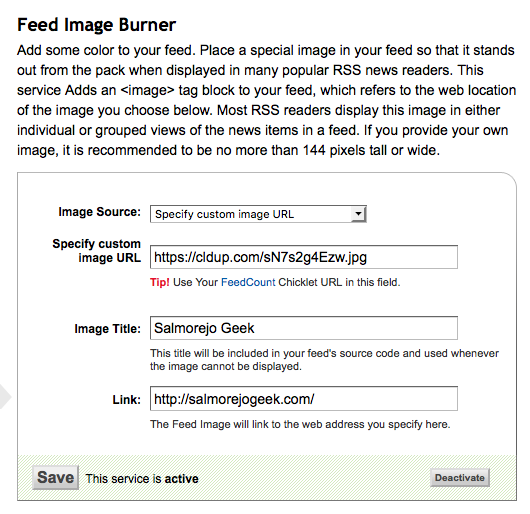 Si queremos usar una imagen ajena a FeedBurner en la solapa Image Source escogemos Specify Custom Image URL, abajo especificamos la URL de donde tengamos nuestra imagen, más abajo le ponemos un título, y si queremos, más abajo, el enlace hacia nuestro podcast.