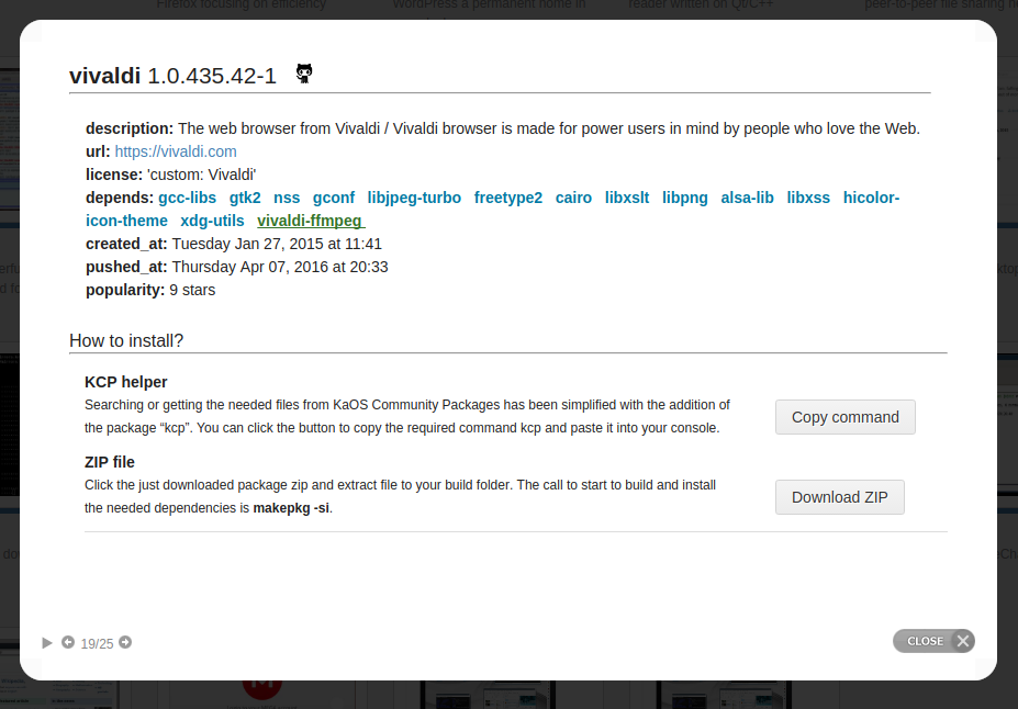 Si os fijáis en la siguiente captura, cuando picamos sobre el nombre de una programa se nos abre una ventana con toda la información del mismo, además tenemos la opción de bajarnos el zip por si queremos hacer una instalación en local usando (makepkg -si) o bien, si queremos proceder directamente a la instalación desde la terminal podemos picar en (copy command) y la orden de instalación del programa vía KCP (kcp -i programa) se nos copiará en el portapapeles para que la peguemos en la terminal.