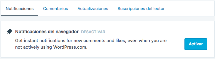 Teniendo también disponible la posibilidad que se nos notifique la interacción con nuestros comentarios en otros sitios de WordPress.com.