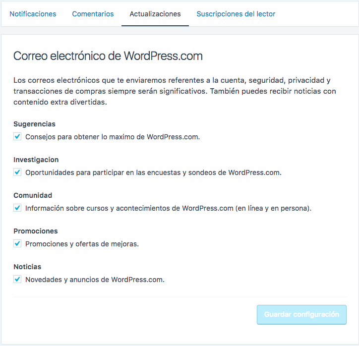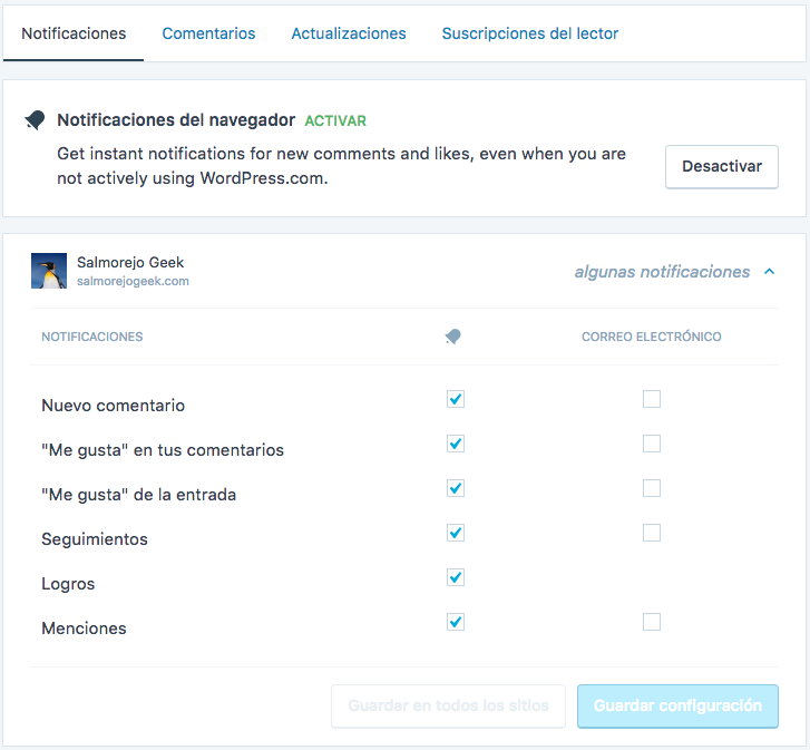 En el caso de que tengamos más de un blog en WordPress.com asociado a nuestra cuenta podemos configurar estas notificaciones de manera independiente por cada blog que tengamos.