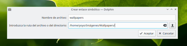 En el cuadro que se nos abre solo debemos ponerle un nombre al archivo de enlace que vamos a crear y la ruta hacia nuestra carpeta con nuestros fondos de escritorio.