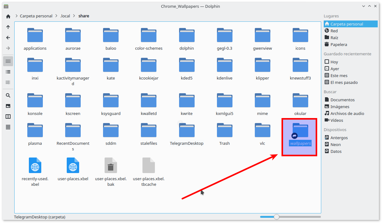 Abrimos Dolphin en nuestro directorio personal, pulsamos en nuestro teclado F8 para ver los archivos ocultos, y nos dirigimos a .local/share.