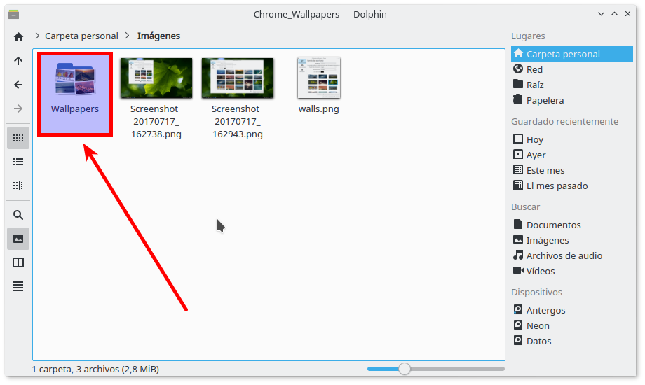 Una vez tengamos esa carpeta con nuestros fondos, podemos llamarla Wallpapers, por ejemplo, la situamos en donde más nos guste. Para el ejemplo la pondré en mi directorio personal en el directorio imágenes.