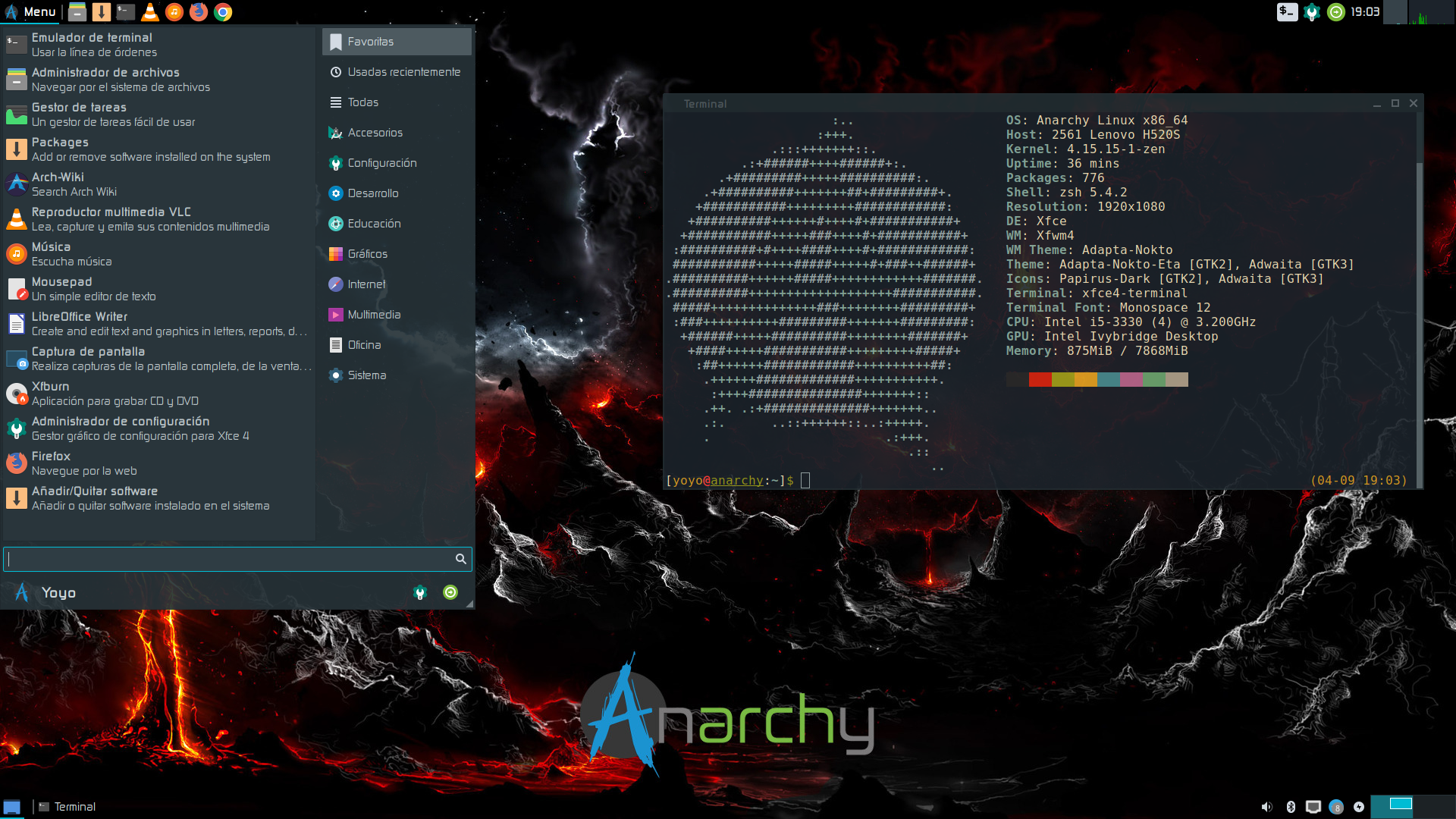 Acabo de instalar Anarchy Linux 1.0.0 con XFCE en mi viejo PC Lenovo y me está gustanto bastante. Siempre dije que con XFCE solo tendría Manjaro, y acabo de romper mi promesa. No obstante, le he sido infiel con su madre Arch.