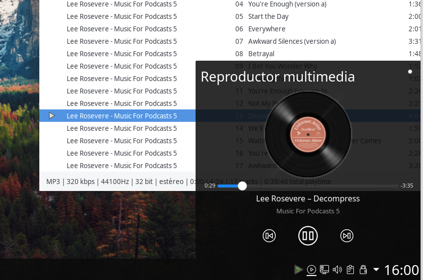 De ahora en adelante cuando abramos el reproductor DeaDBeeF ya tendremos la información de la música que estemos escuchando y podremos interactuar con el en el icono de sonido, o multimedia, de Plasma, en este caso.