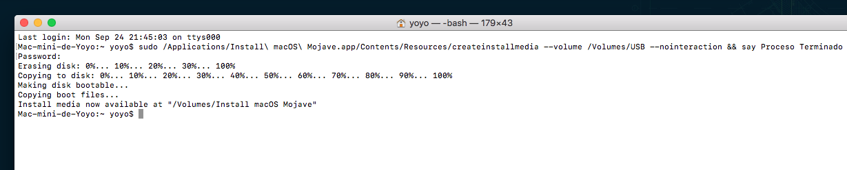 sudo /Applications/Install\ macOS\ Mojave.app/Contents/Resources/createinstallmedia --volume /Volumes/USB --nointeraction && say Proceso Terminado