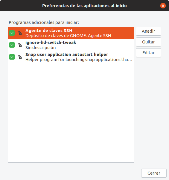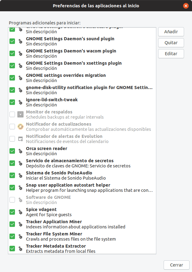 Ubuntu en sus últimas versiones ha escondido la mayoría de estos servicios y aplicaciones de inicio mostrando tan solo una pequeña parte como podemos ver en esta captura de las preferencias de las aplicaciones al inicio.