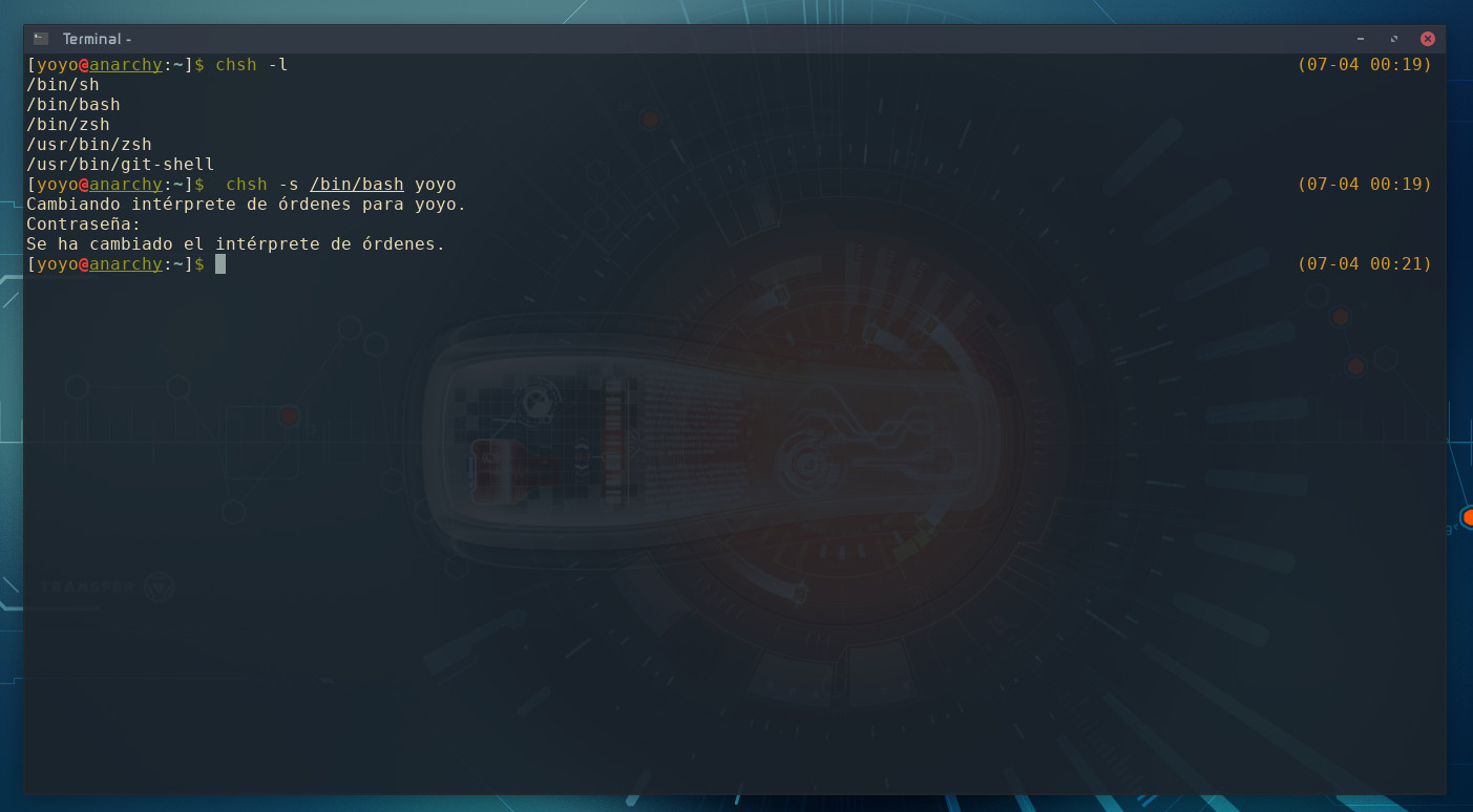 Como tengo bash disponible procedo al cambio usando la orden: chsh -s /bin/bash usuario. En donde usuario sería nuestro usuario, yoyo en mi caso.