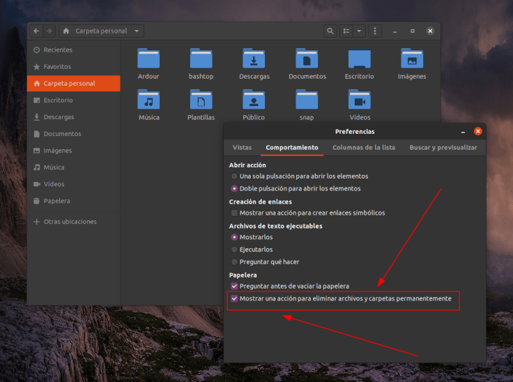 Ahora, dentro de la pestaña Comportamiento, marcamos la opción «mostrar una acción para eliminar archivos y carpetas permanentemente»