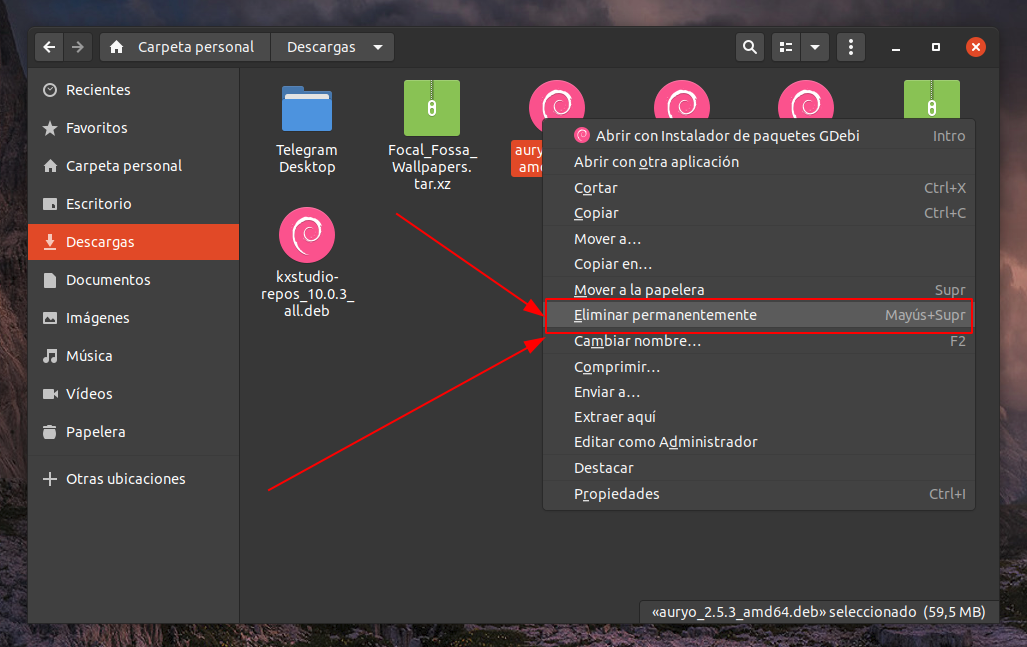 Pero si queremos eliminar directamente los archivos sin que pasen por la papelera también podemos hacerlo desde el navegador Archivo de Gnome. Igualmente esta es una opción a tratar con cuidado porque si erroneamente eliminas algo que no querías borrar luego te será imposible o muy díficil de recuperar.