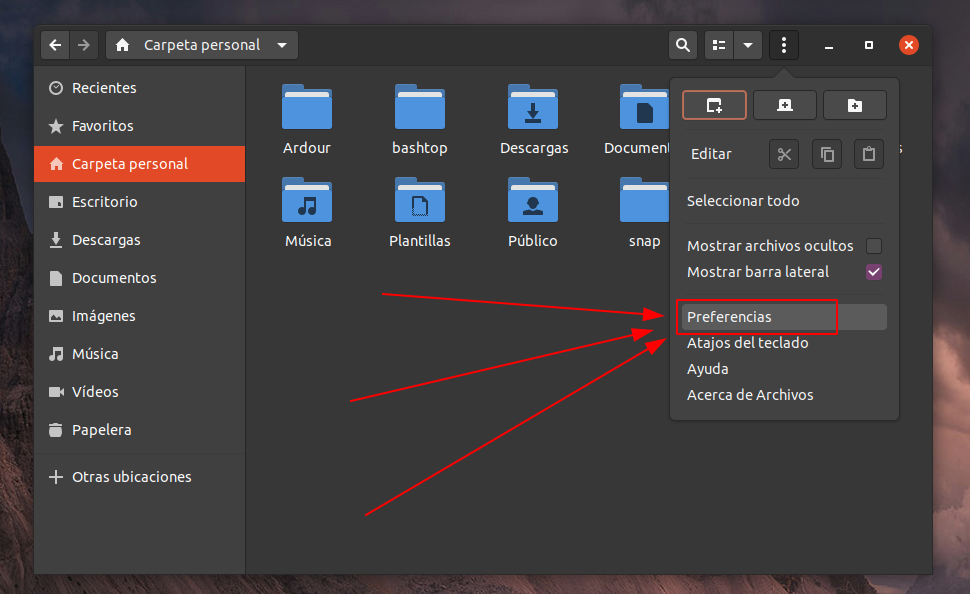 Abrimos el navegador Archivos y picamos en los tres puntitos verticales de la derecha y escogemos preferencias.