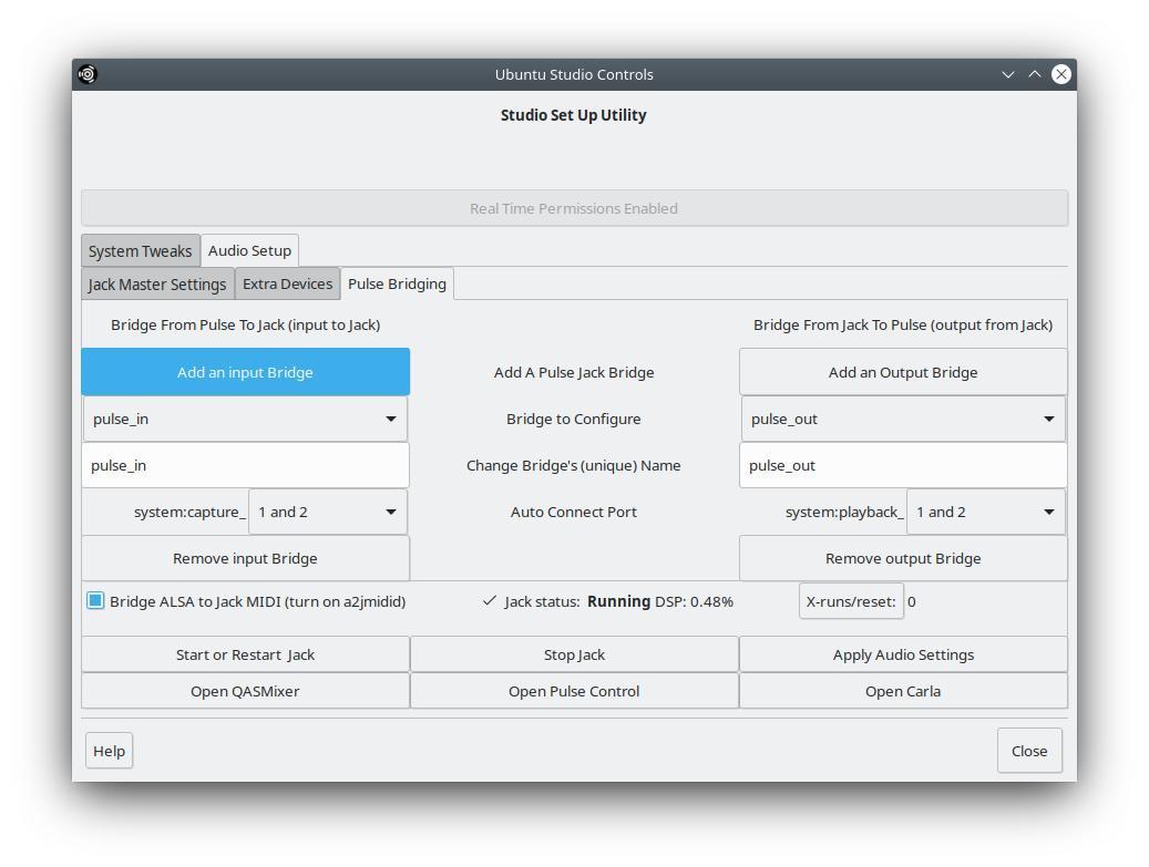 Como podéis apreciar en las capturas, aquí el puente lo hace cn Alsa en vez de con Pulseaudio como en mis tutoriales con Cadence.