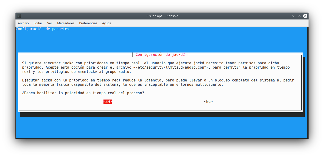 Instalando estos paquetes nos saldrá una ventana por si queremos activar la prioridad en tiempo real de JACK. Nos movemos con las flechas de dirección a SI y aceptamos con la tecla enter.