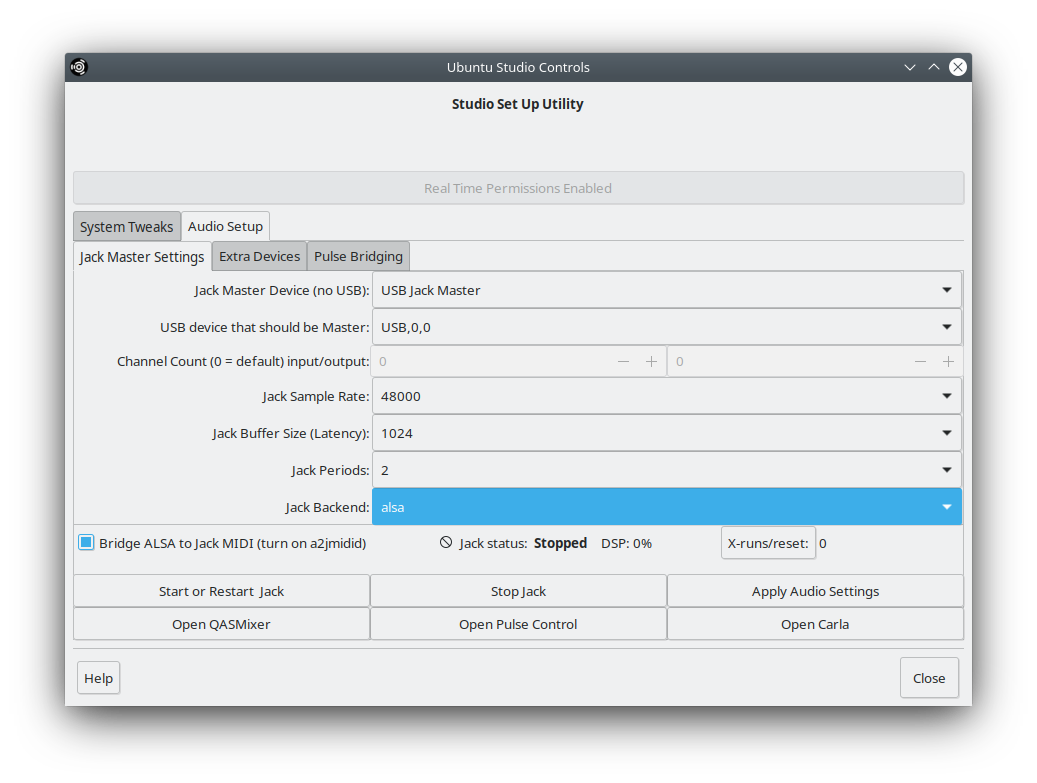 Hecho esto volvemos a la aplicación Ubuntu Studio Controls y en la pestaña Jack Master Settings en USB device that should be Master elegimos nuestro hardware de audio, en mi caso y como dije antes es una Scarlett 2i2 que la reconoce como USB,0,0.