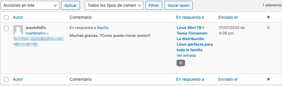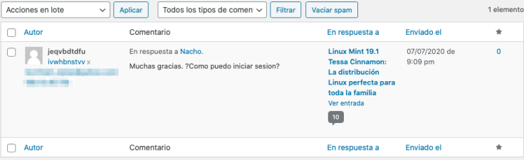 El método que usan siempre es el mismo, desde IPs variadas, nombres de usuario aleatorios sin sentido, sin credenciales y con un único mensaje que se repite en todas las entradas, ya sea en forma de contestación al artículo, al autor o a otro usuario que haya comentado en el artículo.