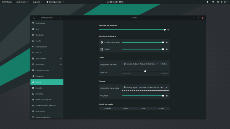Y ya estaría. Para un uso normal de este server de audio realmente no hay que hacer nada, solamente seleccionar nuestra tarjeta de audio en la configuración de Gnome, sección sonido, en este caso, y ya.