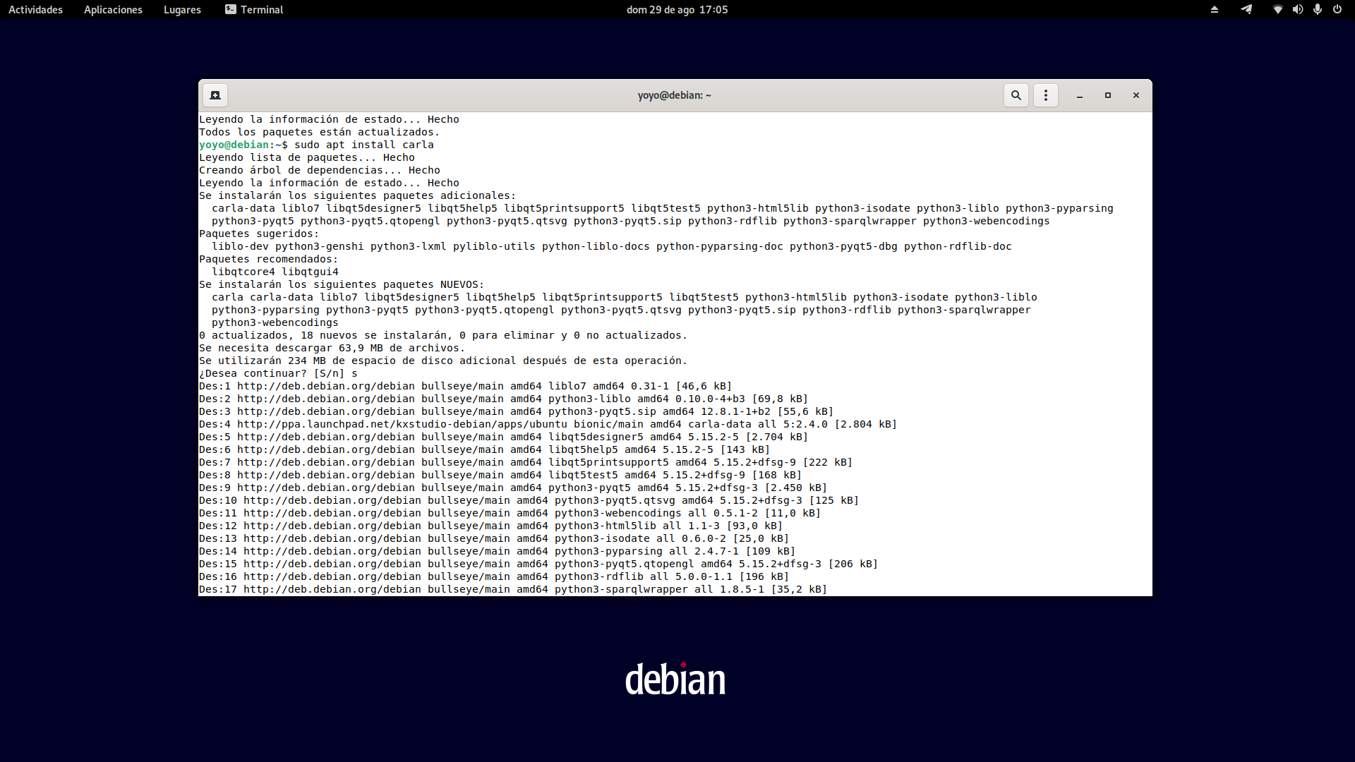 Lo siguiente es refrescar repos e instalar Carla, lo cual nos instalará además las dependencias necesarias.