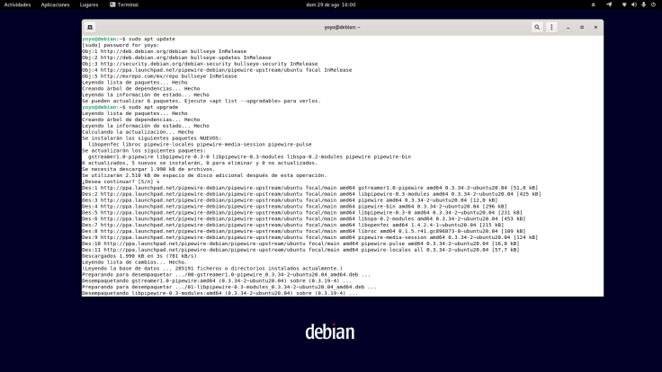 Como Pipewire ya viene instalado en Debian 11 en su versión 0.3.19, una versión vieja, vamos a refrescar repos y a actualizar los paquetes ya instalados en la propia Debian. También se nos instalarán algunos nuevos paquetes necesarios.
