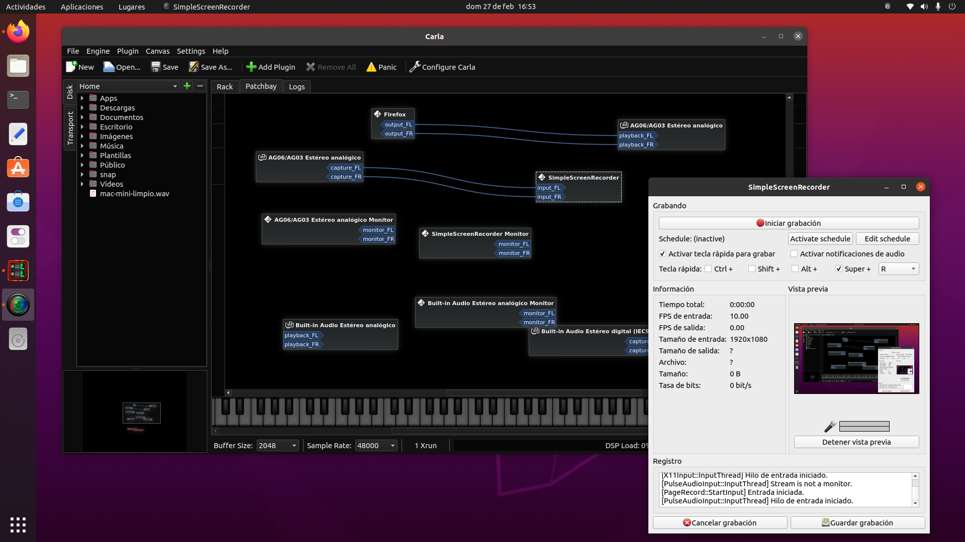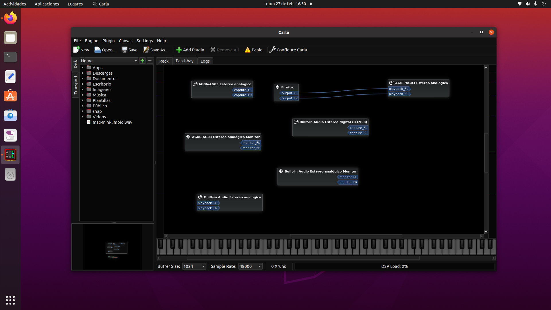 Si eres un usuario avanzado y quieres hacer conexiones virtuales de audio puedes usar los Patchbay Carla o Qjackctl. Mi preferencia es Carla pero esto va en gustos.