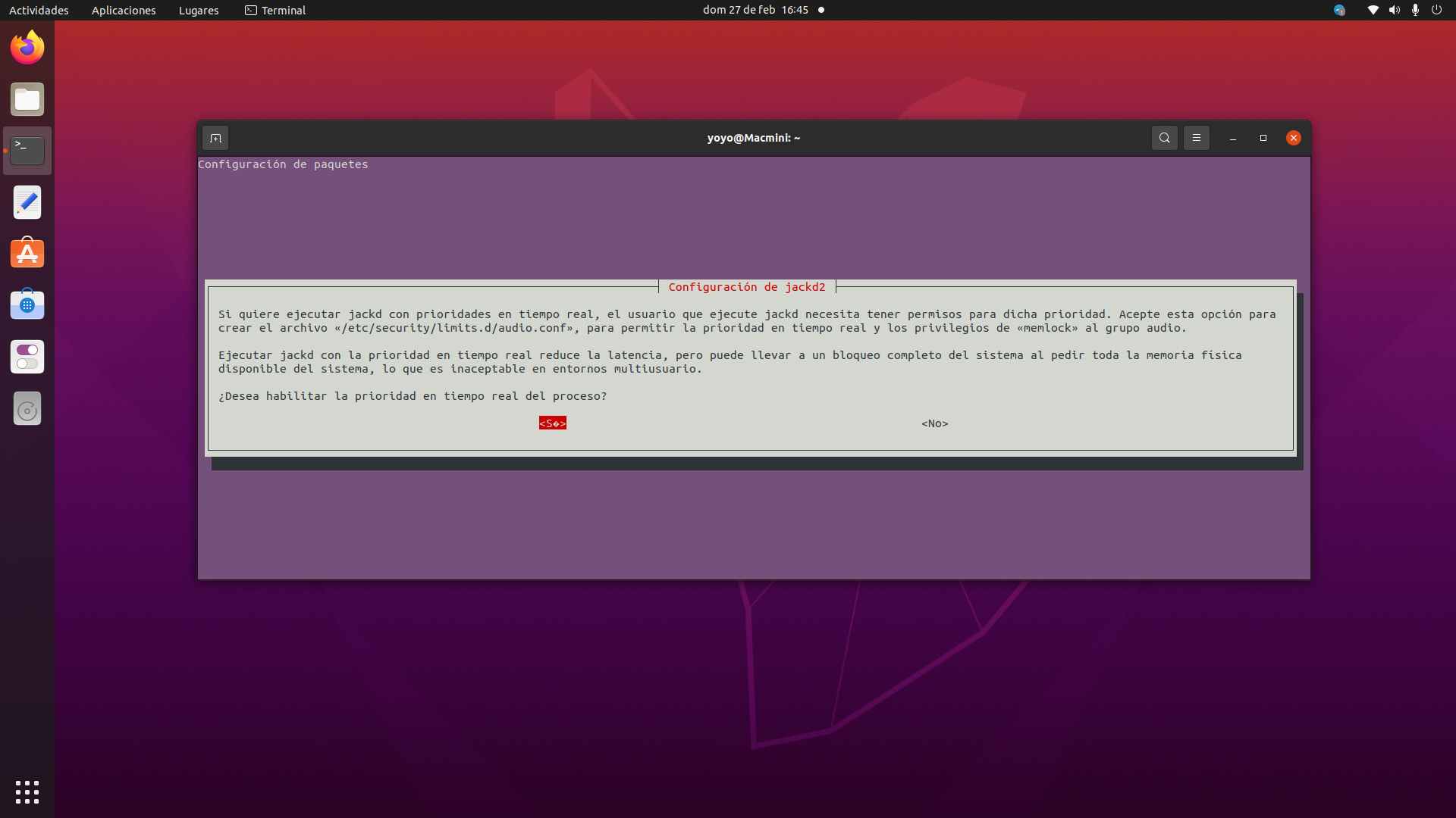 Si eliges qjackctl te saldrá la ventana para habilitar la prioridad en tiempo real en el tema audio, marca si y acepta con la tecla Enter.