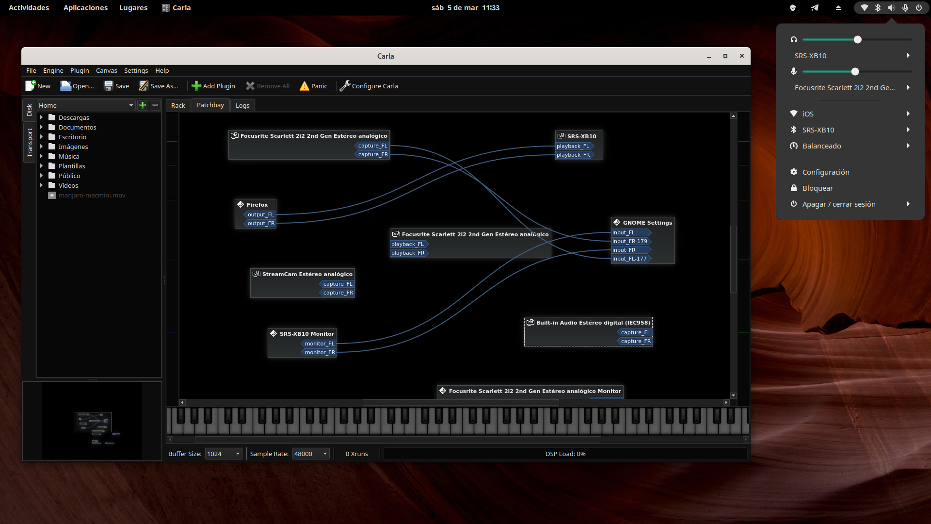 Si eres un usuario avanzado y quieres hacer conexiones virtuales de audio puedes usar los Patchbay Carla o Helvum. Mi preferencia es Carla pero esto va en gustos, respecto a Helvum no lo entiendo, o no sé usarlo. También podríamos usar Qjackctl, eso ya cada cual, yo sigo con Carla.