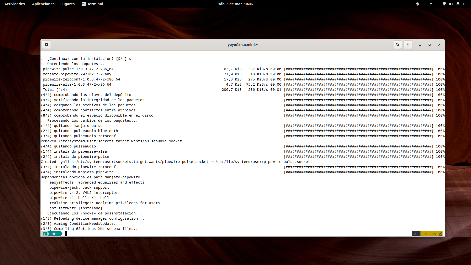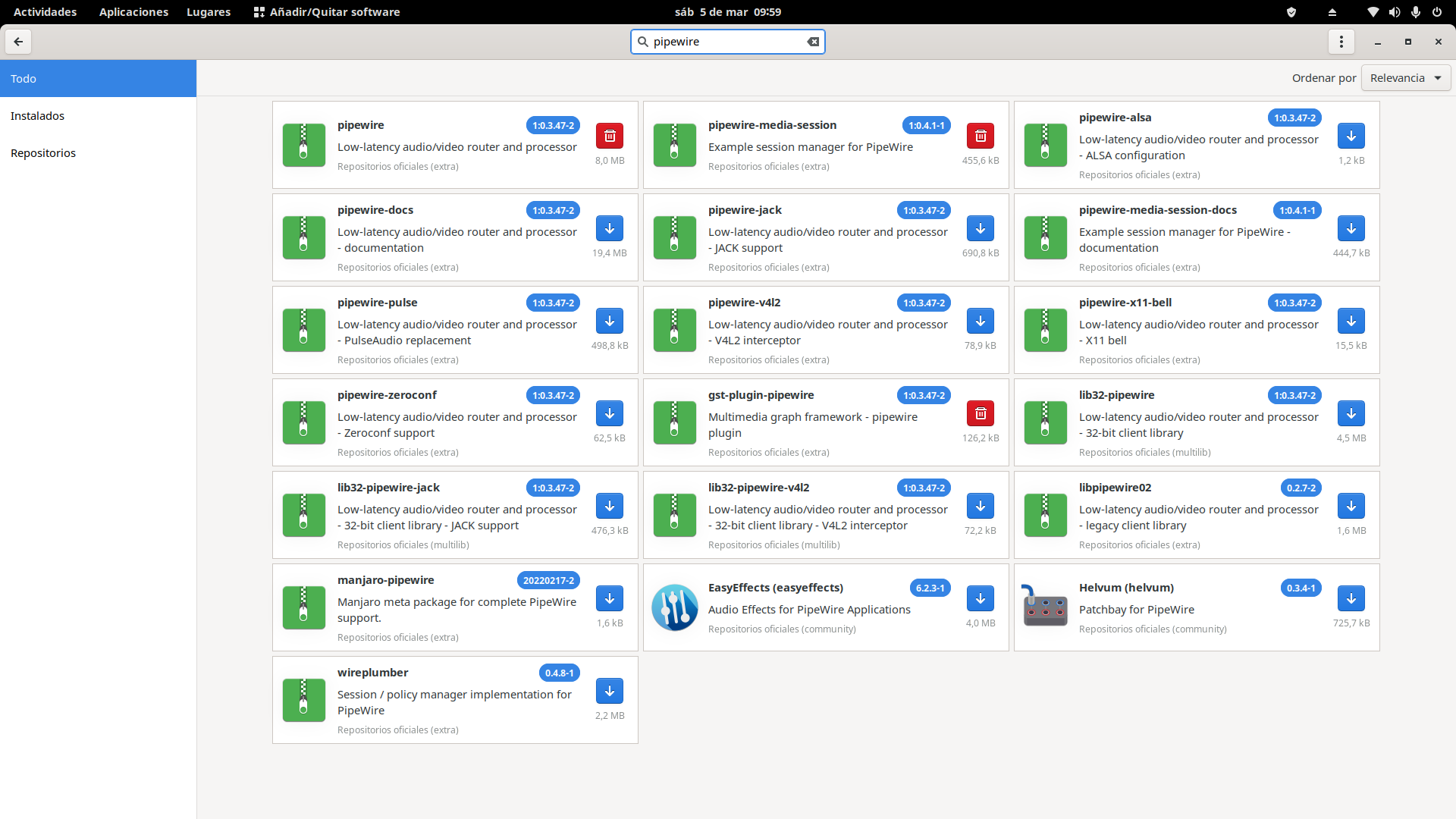 Respecto a otras distros como puedan ser Debian o Ubuntu, Manjaro nos facilita mucho las cosas a la hora de instalar PipeWire y WirePlumber pues todos los paquetes se encuentran en repositorios oficiales y además cuenta con un meta-paquete que nos hace gran parte del trabajo como puede ser instalar paquetes, resolver conflictos y activar vía systemd PipeWire y WirePlumber.