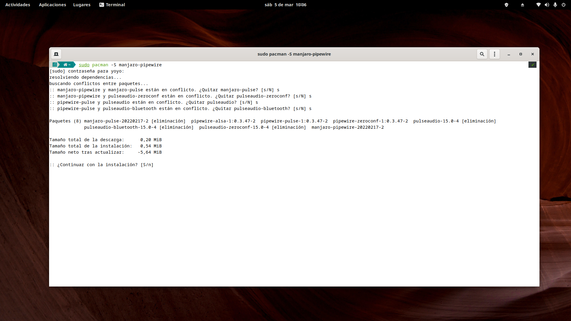 En una terminal. Cuando nos pregunte si quitar pipewire-media-session contestamos afirmativamente.