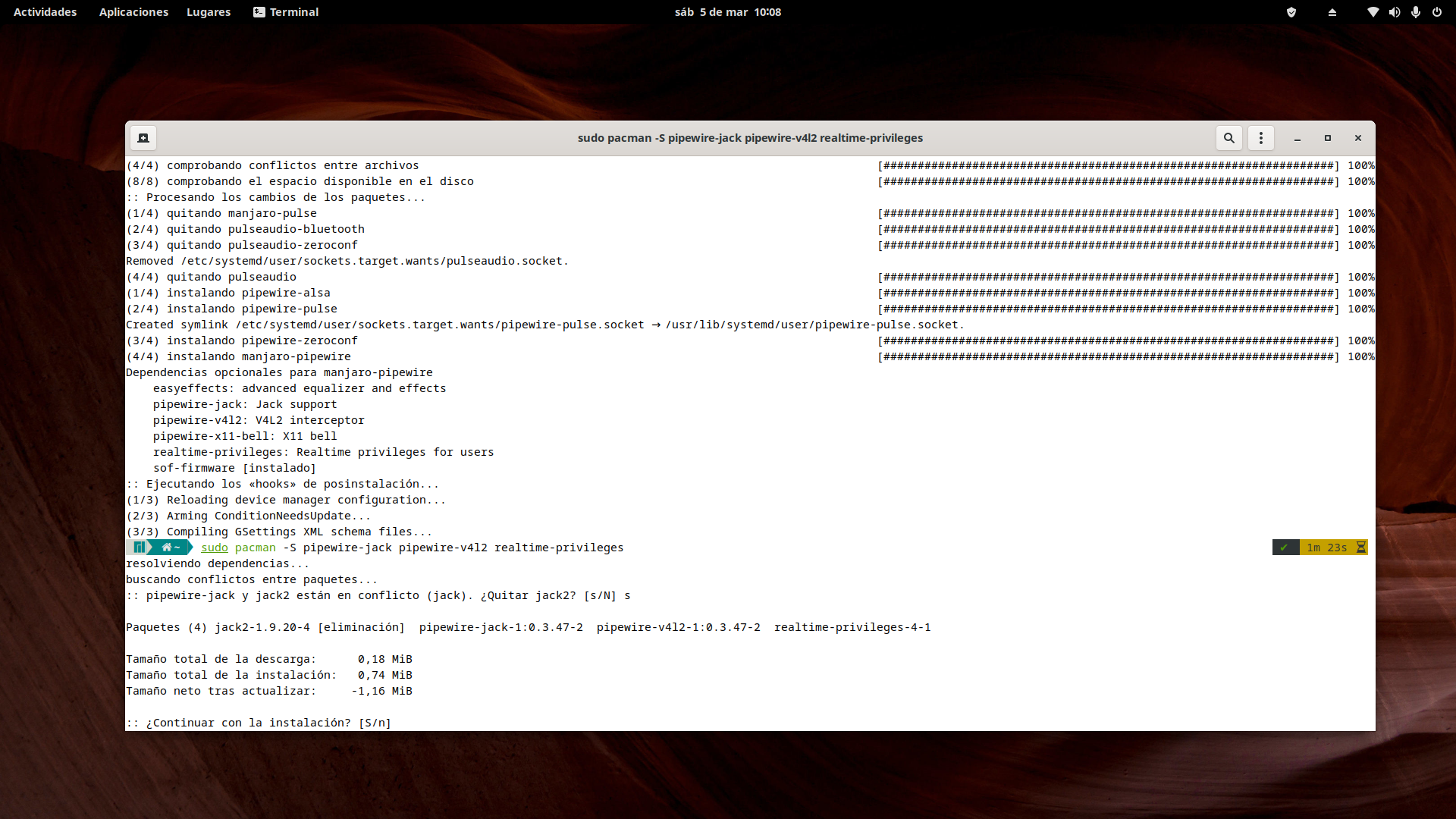 Gran parte del proceso lo tenemos instalando el meta-paquete manjaro-pipewire, que se encargará de instalar los paquetes necesarios y desinstalar los incompatibles del viejo PulseAudio.