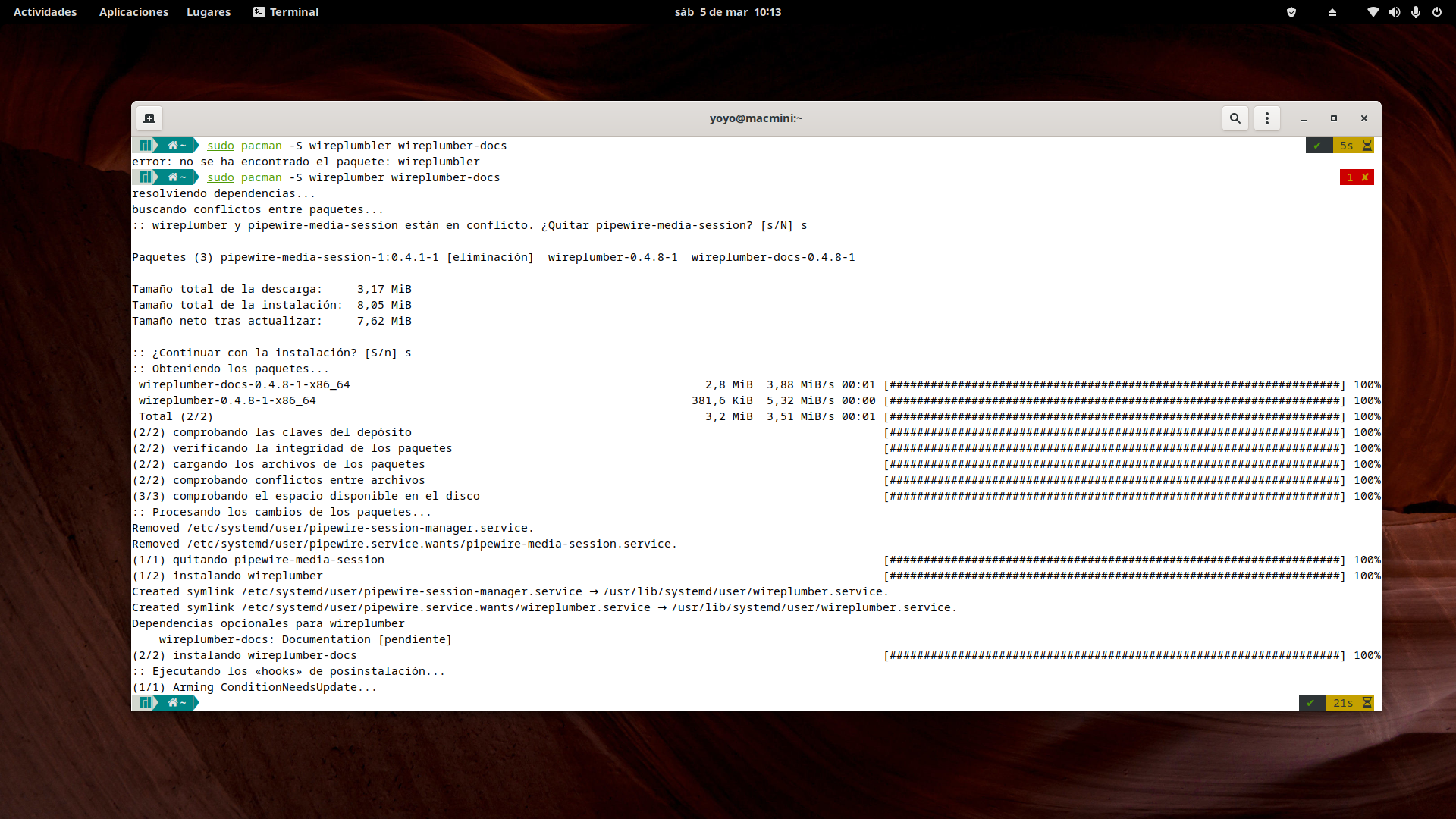 Ahora vamos a instalar WirePlumber, el nuevo gestor de sesiones que reemplaza a pipewire-media-session.