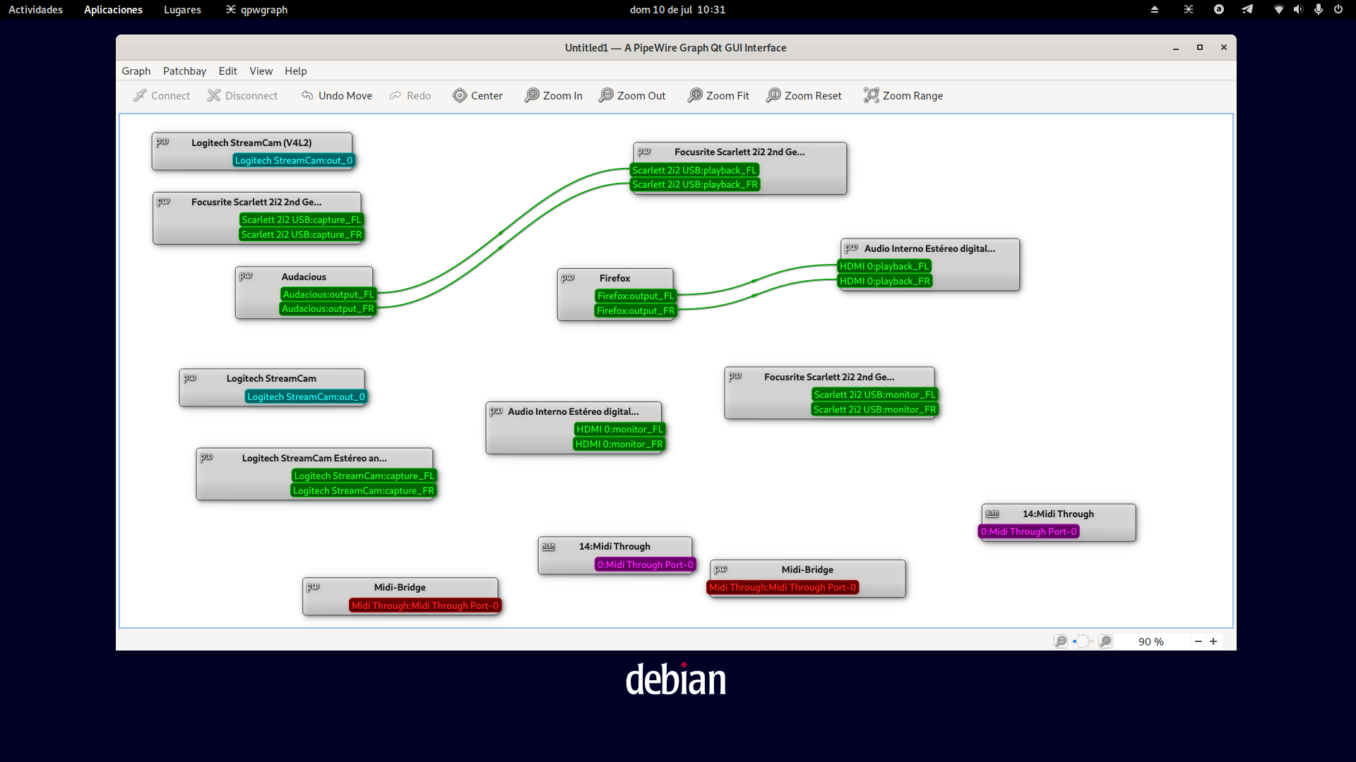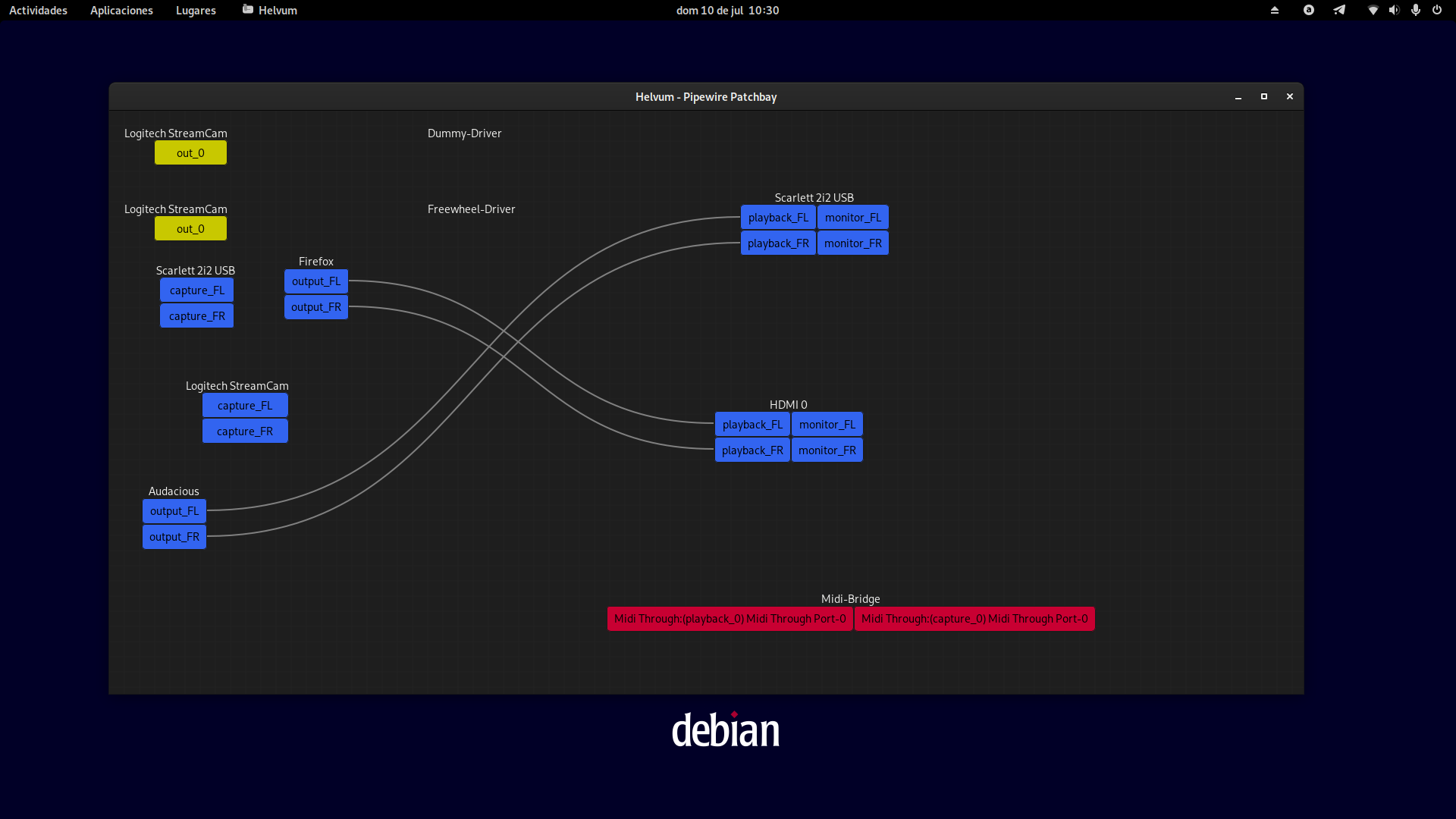 Si eres un usuario avanzado y quieres hacer conexiones virtuales de audio puedes usar los patchbay Helvum o qpwgraph.