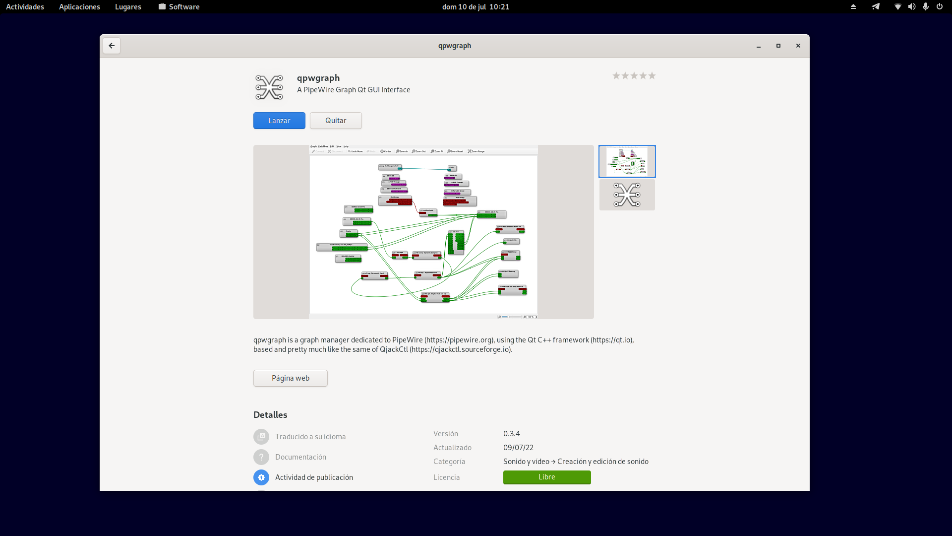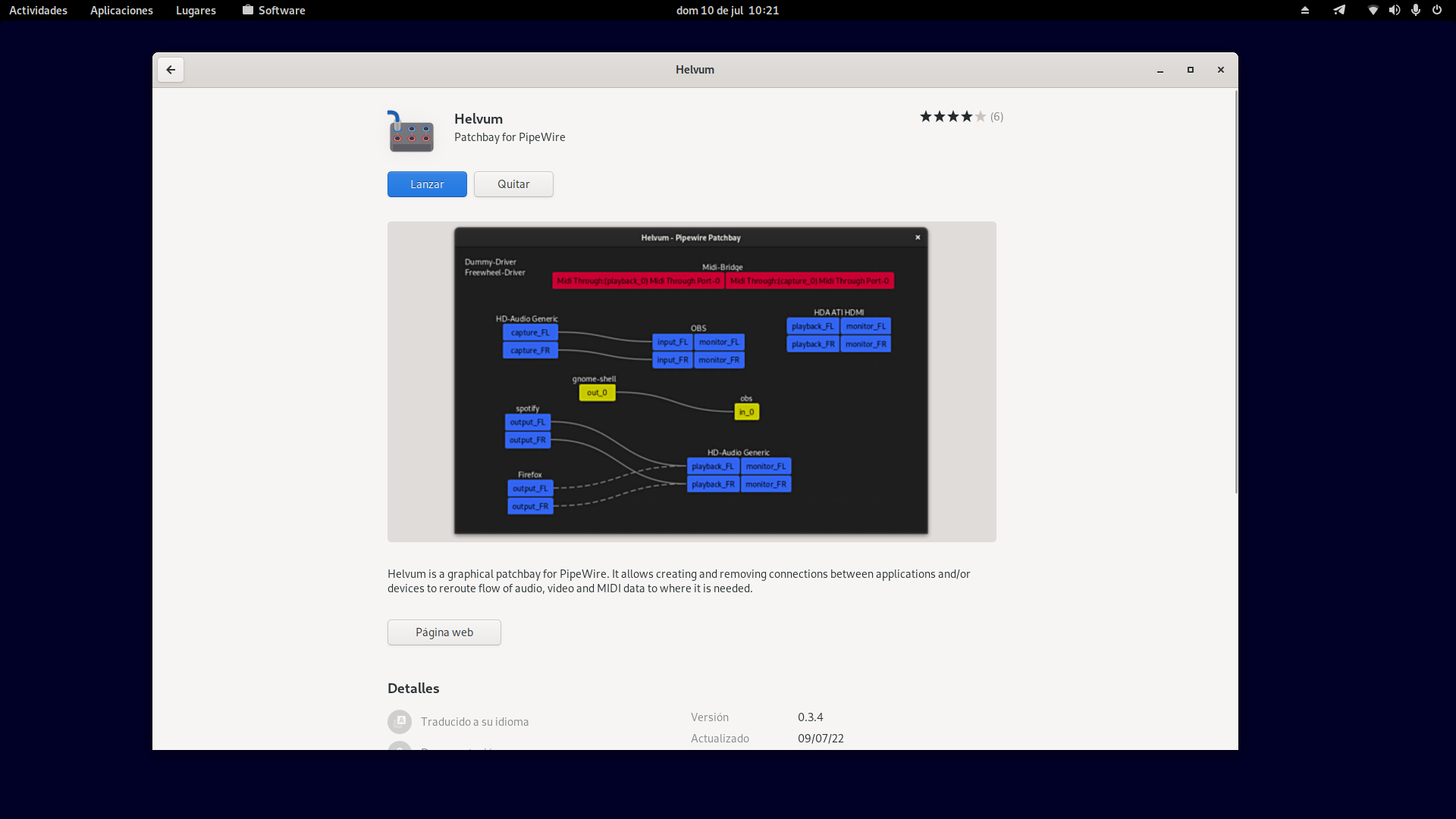 Ya que tengamos soporte Flatpak en Debian instalamos Helvum y qpwgraph como nos indican en Flathub o desde alguna aplicación de software, en mi caso la tienda de software de Gnome.