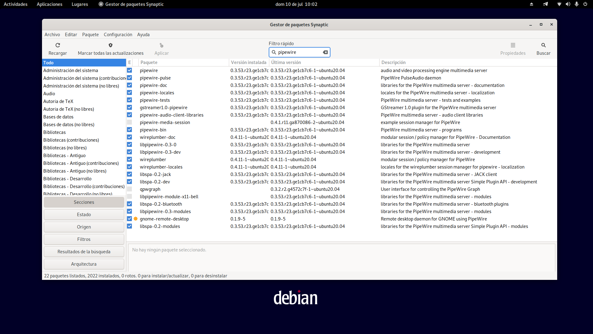 Podemos comprobar en el gestor de paquetes Synaptic si lo tenemos todo. A fecha de hoy la última versión de Pipewire en este repositorio PPA es la 0.3.53.