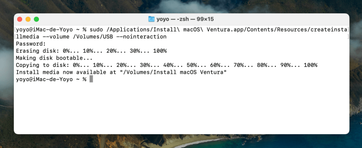 sudo /Applications/Install\ macOS\ Ventura.app/Contents/Resources/createinstallmedia --volume /Volumes/USB --nointeraction