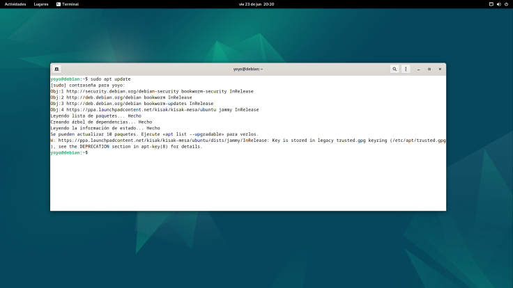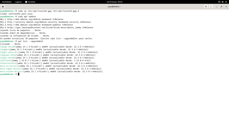 Una vez copiada ya le podemos tirar un update y podemos ver que se puede actualizar desde la 22.3.6 de repos de Debian 12 a la 23.1.3 del PPA de kisak.