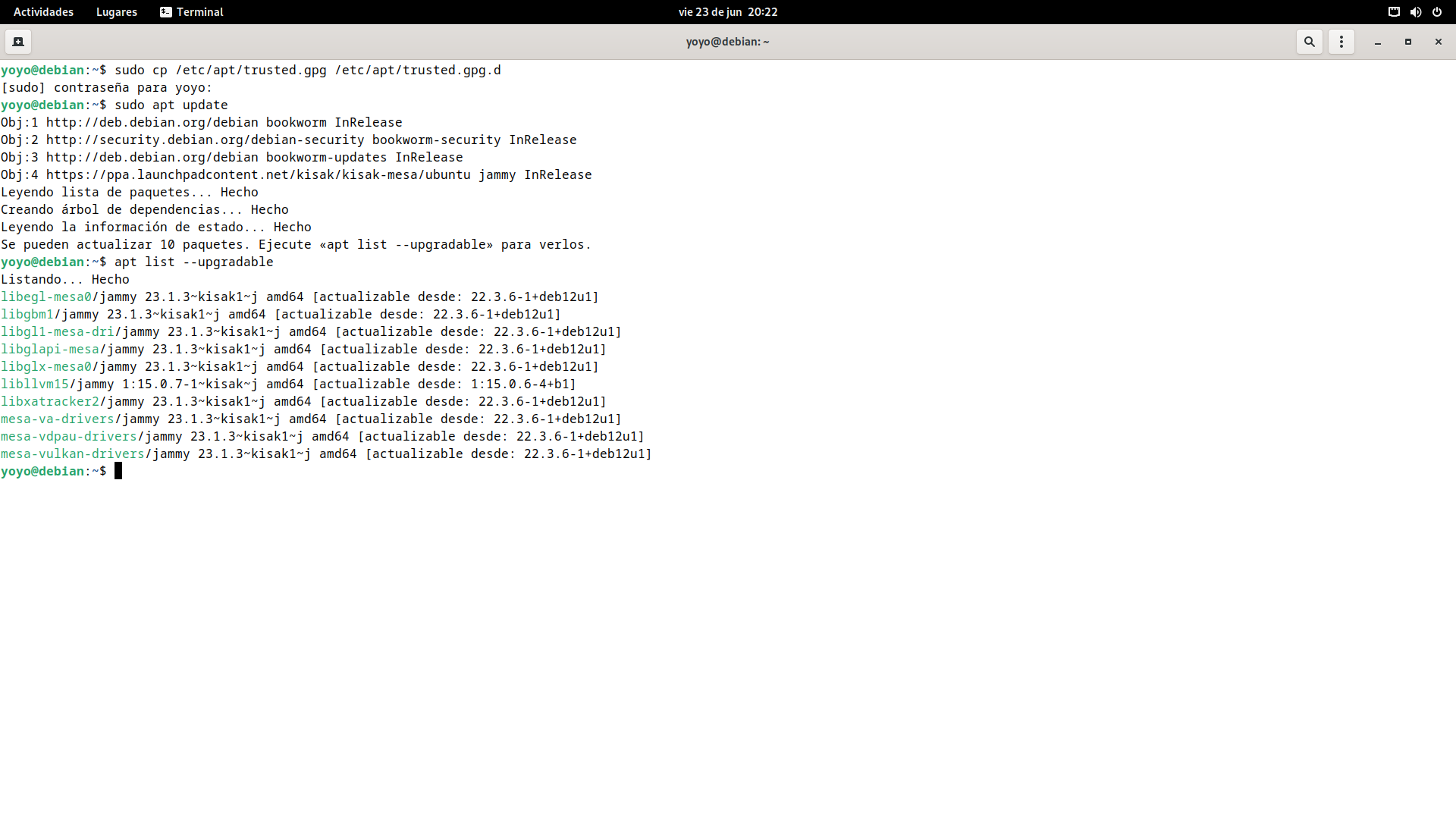 Una vez copiada ya le podemos tirar un update y podemos ver que se puede actualizar desde la 22.3.6 de repos de Debian 12 a la 23.1.3 del PPA de kisak.