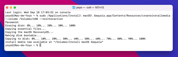 sudo /Applications/Install\ macOS\ Sequoia.app/Contents/Resources/createinstallmedia --volume /Volumes/USB --nointeraction